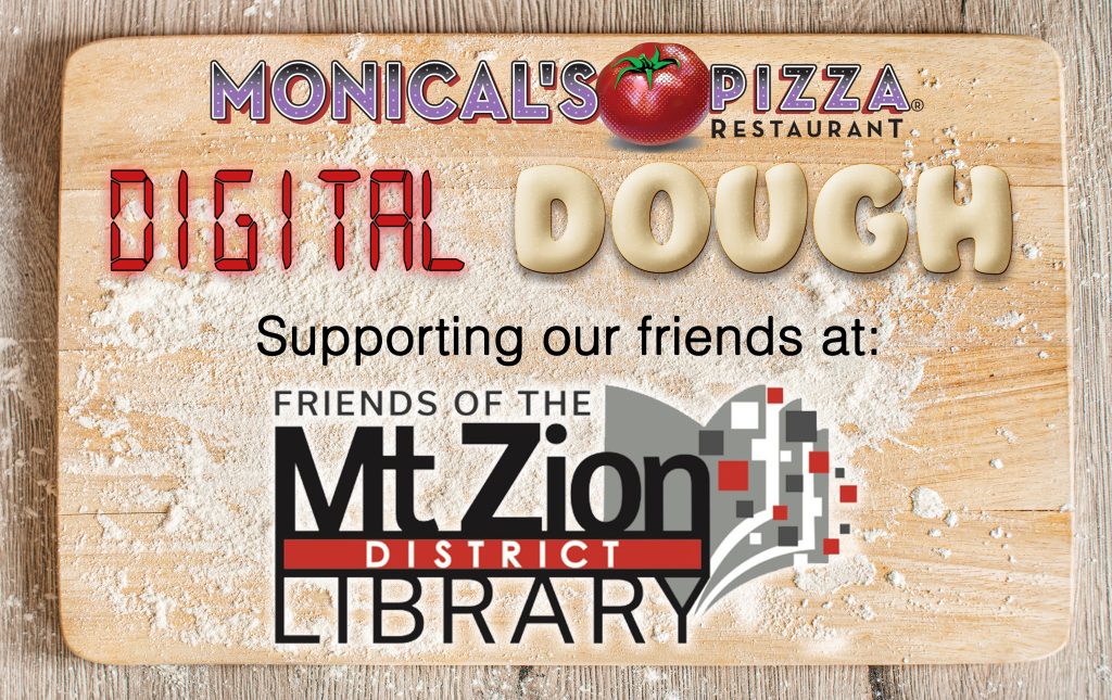 Purchase a Monical’s Pizza/Mt. Zion District Library eGift Card in any whole dollar amount from February 24, 2025 – March 3, 2025, and we will donate 10% of your purchase back to Mt. Zion District Library Monical’s Pizza eGift Cards never expire and can be used at every Monical’s Pizza Restaurant!