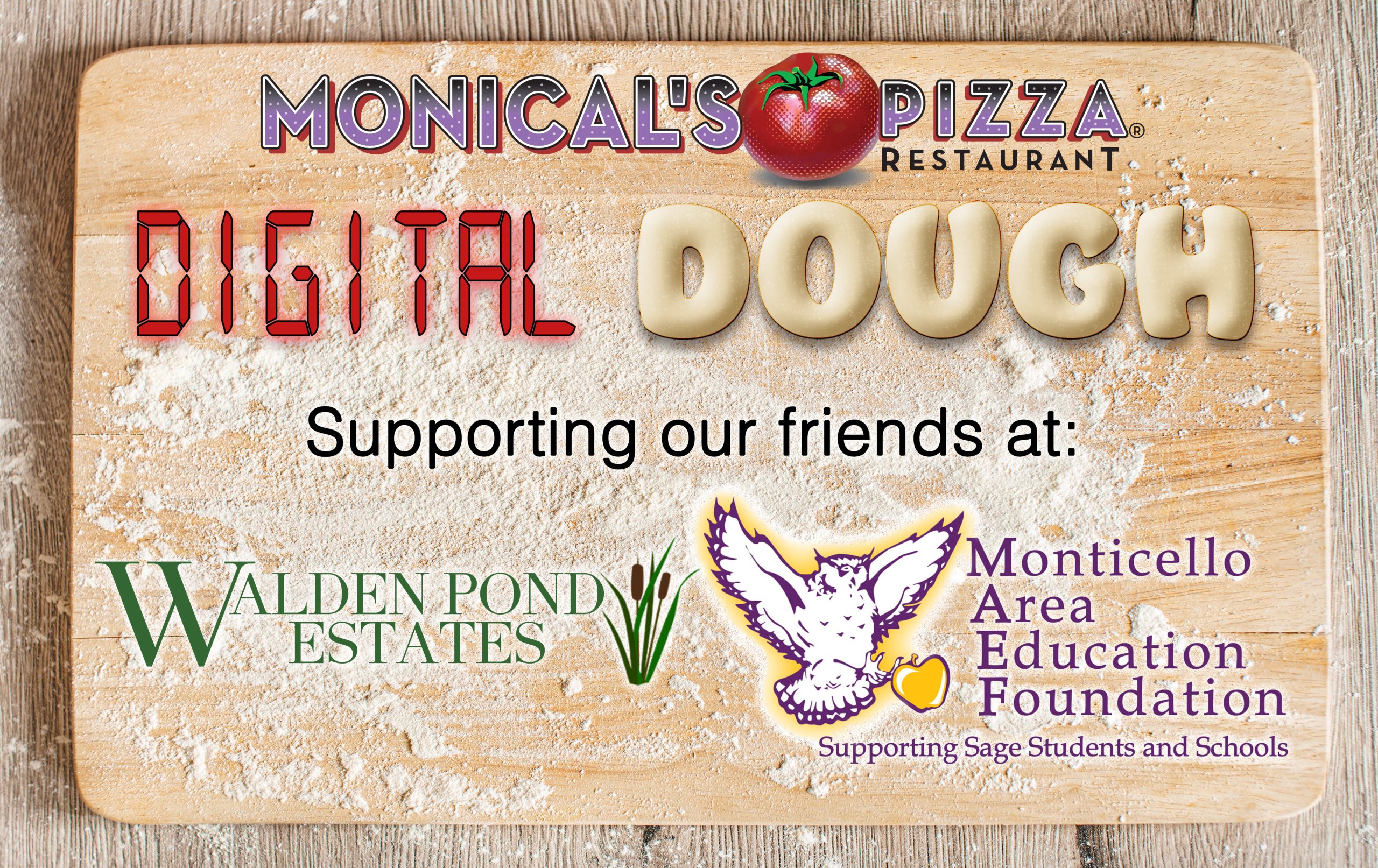 Purchase a Monical’s Pizza/Walden Pond Estates-MAEF eGift Card in any whole dollar amount from April 7, 2025 – April 14, 2025, and we will donate 10% of your purchase back to Monticello Area Education Foundation! Monical’s Pizza eGift Cards never expire and can be used at every Monical’s Pizza Restaurant!