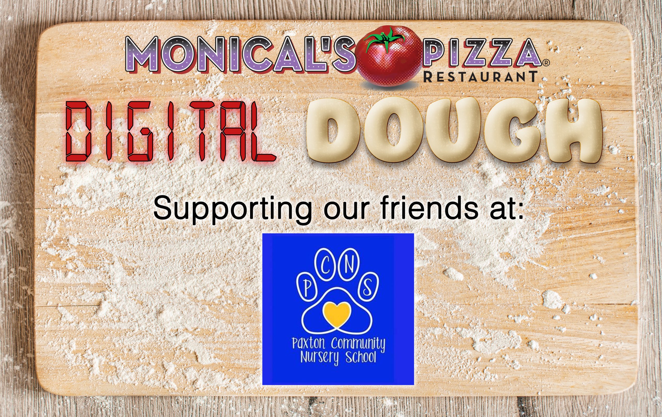 Purchase a Monical’s Pizza/Paxton Community Nursery School eGift Card in any whole dollar amount from September 22, 2025 – September 29, 2025, and we will donate 10% of your purchase back to Paxton Community Nursery School! Monical’s Pizza eGift Cards never expire and can be used at every Monical’s Pizza Restaurant!